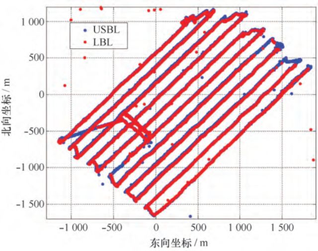 在测量时,测距仪通过ROV的光纤电缆与水面的超短基线部分进行时钟同步,并能够将定位结果实时通过光纤传输至ROV导航单元。该系统为ROV提供了水下长基线的精确定位和水面超短基线的跟踪服务,其内部的测距仪与水下信标相互应答,实时解算ROV的位置信息,水面超短基线采用时钟同步方式检测测距仪的询问信号,完成对ROV的定位和跟踪。ROV测量航线间距150m,距底高度40m进行测量,自身动力驱动且能保证其姿态相对稳定。在近底多波束测量过程ROV航迹线如图4所示。
