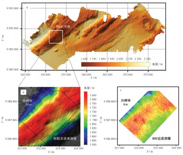 一般来讲,在深海海域,船载多波束系统所获得的海底地形数据的分辨率最高可以达到50m。由于船载多波束测量系统拥有较宽的覆盖率和高效的测量方式,目前是大面积水深测量的优先选择。但在某些重点研究区域,由于一些海底地质现象如冷泉、热液系统发育的范围较集中,数十米分辨率的数据难以精细描述热液或冷泉发育区的地形,不能为深入的研究目标提供精确指引。因此,有必要根据研究目标进一步确定重点典型研究靶区进行精细测量。本文阐述了基于ROV近海底测量高分辨地形的方法,通过2015年5~7月在西太平洋马努斯盆地的实践和应用,获得了PACMANUS热液区的高分辨率地形并进行分析。