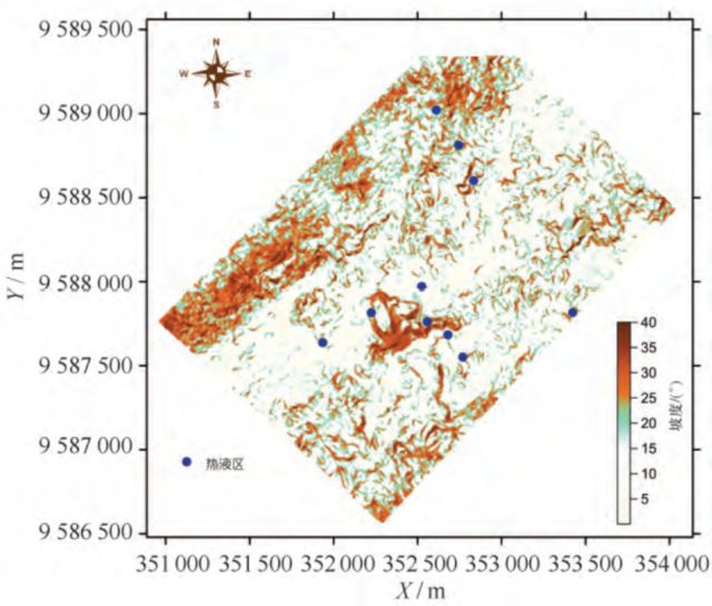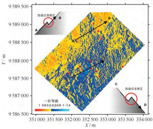图10定向一阶导数的分布特征及与热液点发育区的关系