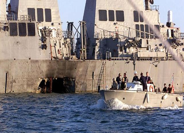 停泊在也门亚丁港的科尔号遭自杀式小艇袭击