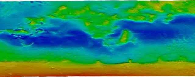 通过实测数据分析,无人艇在逆流、顺流、船浪影响等状态下最大偏航距约为0.8米,侧流状态下最大偏航距约为0.5米。经对测量数据处理,形成0.1m格网(分辨率)的360×1000米2全覆盖水深图,水深范围在3.5-13米之间,中间水域为人工开挖航道,深度介于9-13米之间,部分地区有沙包突起。近边壁水深最浅,最浅处约3.5米,人工开挖航道与边壁有明显陡坎,水域中可见少量锚系拖痕,其中作业水域发现约5.5×5.5米不明物体,推测为水下沉块。