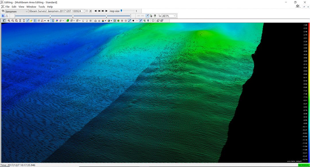 广东省江门市某段航道西侧,该测区存在清淤船挖泥船定点作业,航道上常有运沙船等大型船只经过,测量条件相对复杂。2017年12月7日,在2级海况下,利用该艇共完成1000米×600米测区水下地形全覆盖测量,测线总长约26公里,其中主测线约25公里,联络测线约1公里。