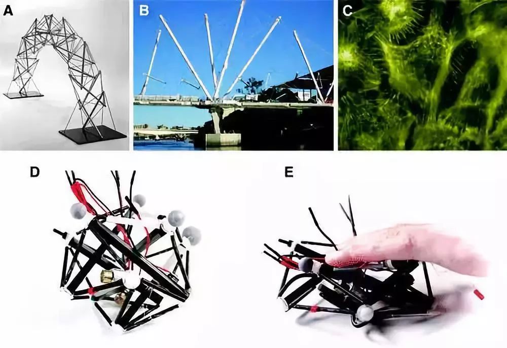 图1:我们的软体张拉整体机器人的概念。(A)第一个出现于艺术品中的张拉整体结构,与Kenneth Snelson的雕塑一起出现。(B)它们后来被用于建筑,例如Kurilpa桥(澳大利亚布里斯班)。(C)最近,张拉整体被认为是活细胞机械转导的良好模型。(D)我们的张拉整体机器人基于碳撑杆和弹簧。它由三个振动器(粘在三个支柱上)驱动,其频率通过试错学习算法(材料和方法)进行自动调整。(E)得益于张拉整体结构和弹簧的顺从性,我们的机器人在变形时会保持其完整性并弹回初始形式。