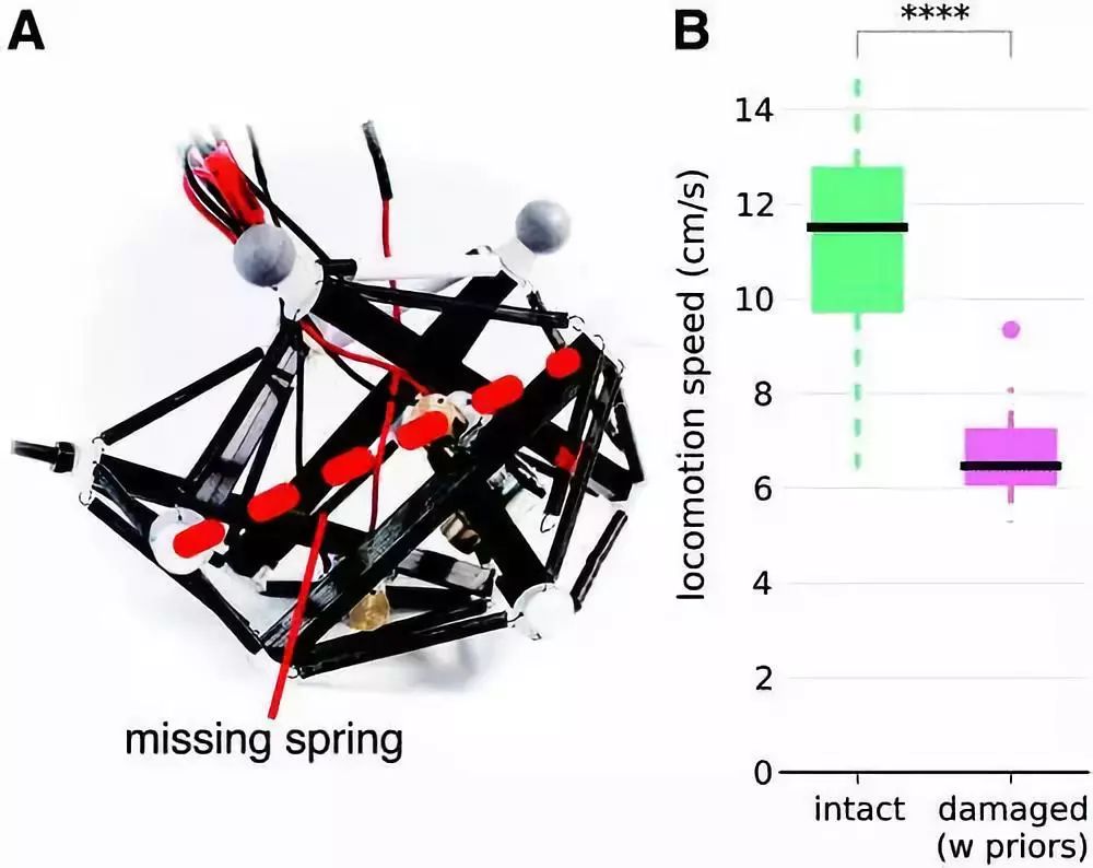 图3:机器人损坏的实验。(A)损坏的机器人,正如图1中所展示的那样一个弹簧从机器人身上断开连接。(B)30次试验后的运动速度。中心标记是中位数,框的边缘是第25和第75百分位数(IQR),晶须对应于范围,晶须(whisker)外的点被认为是异常值(这对应于“四分位间规则”)。每个条件都使用20次独立的算法进行测试。