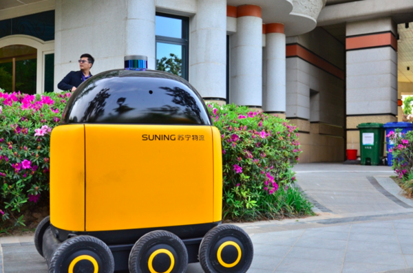 (图:苏宁物流无人快递车亮相南京滨江一号小区)
