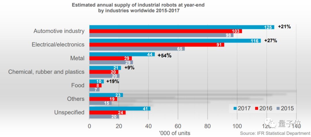 分行业来看,汽车制造业依然位列榜首。2017年,125,200台的成绩,也占到全球销量的近三分之一。比起2016年,有了21%的增长。