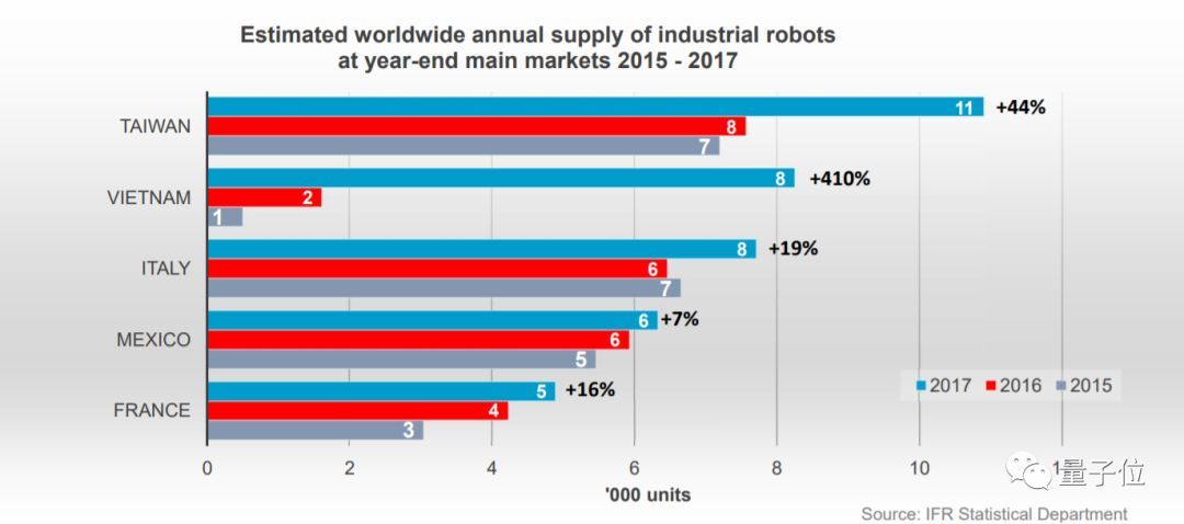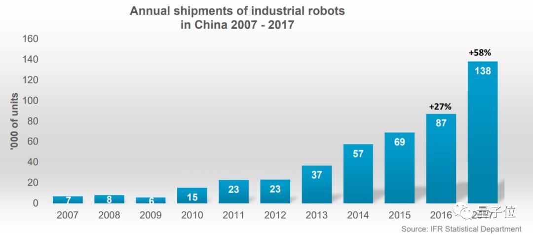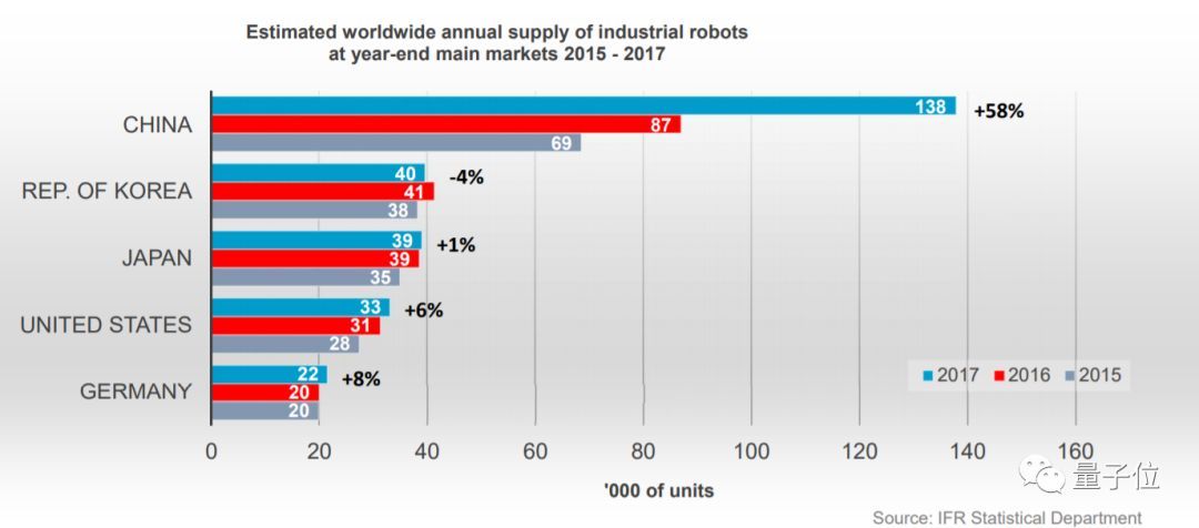 2017年,中国的工业机器人估计安装量 (138,000台) ,比起2016年 (87,000台) 增长了58%,涨幅也是高居榜首。