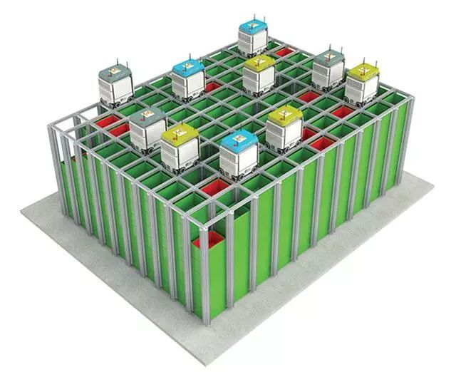 通过4G网络与控制系统连接,这些小车行驶在轨道上,可以完成从取箱、卸到拣货区以及从拣货区取回箱子并放回网格的全操作。同时,这些机器人彼此间通过4G网络也进行连接,避免碰撞。
