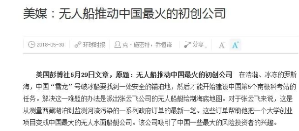 5月29日,美国彭博社以《无人船推动中国最火的初创公司》为题,不无羡慕地报道了中国无人船研制和应用的快速发展,并对中国无人艇企业云洲智能从一个大学创业项目变成中国最大的无人水面船艇公司的传奇经历表示惊叹。
