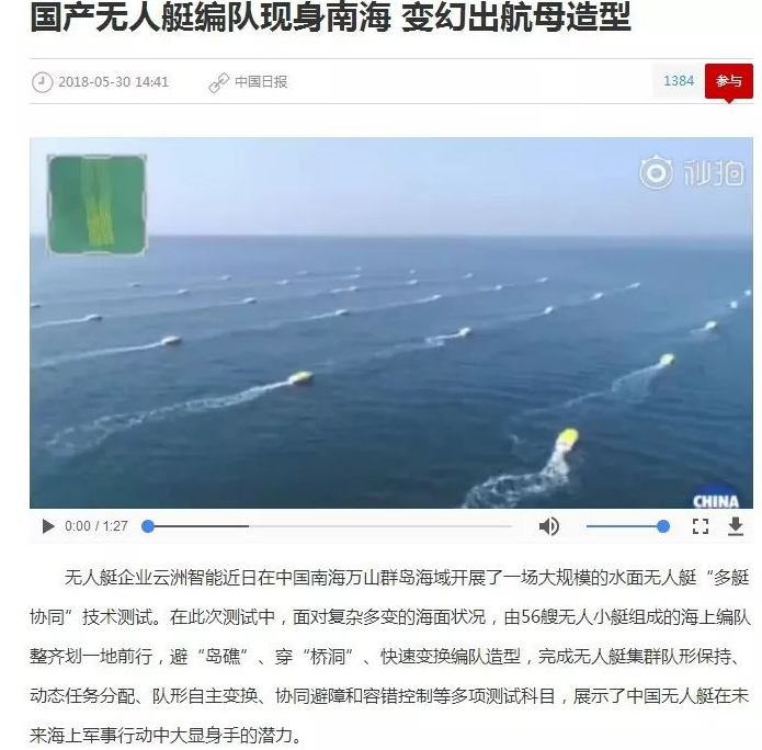 5月30日,环球网、中国日报网、今日头条等以《国产无人艇编队现身南海变幻出航母造型》《无人艇激浪南海 队形变幻闪现航母造型》为题,报道了云洲智能在中国南海万山群岛海域开展的一场大规模的水面无人艇“多艇协同”技术测试,并配发震撼视频,引发广泛关注。