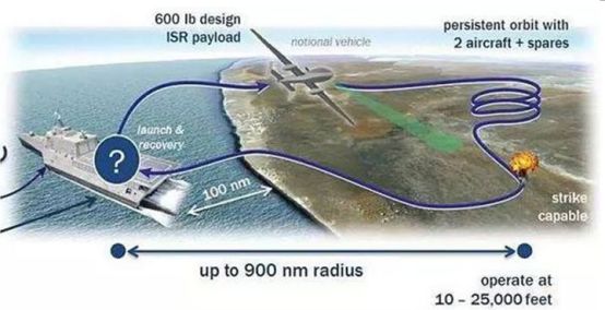 TERN无人飞行器ISR载荷约为600磅左右,其作战范围可达900海里,飞行高度为10~25000英尺,根据设计要求,TERN系统应具备以下四种技术能力:1. 垂直发射/回收能力;2. 情报、监视、侦察(ISR)能力以及电子战和轻当量攻击能力;3. 具备昼夜、各种天气情况下行动的能力;4. 具备电子战/通讯节点功能。