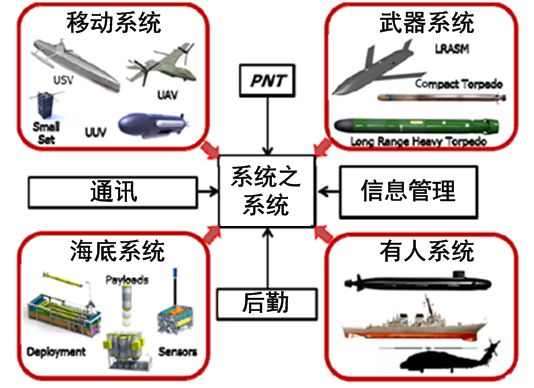 从上图可看出,系统之系统可应用于武器系统、移动无人系统、固定的无人值守系统(海底)和有人系统等。其中,移动无人系统包含无人无人机、无人艇、无人潜航器等装备;武器系统包括美军新型远程反舰导弹LRASM、重型鱼雷等;在固定无人值守系统方面,则包含海底部署的各类载荷、传感器等装置;在有人系统方面,则包括常规的舰船、潜艇、作战飞机等。整个CDMaST系统之系统架构将能够为不同类型装备提供通讯、能源、信息管理和定位/导航及授时(PNT)等服务,提升整体作战水平。DARPA认为,该项目应具备有效、可部署、成本低、持续性强以及自适应性等特性,满足未来海面作战的需求。