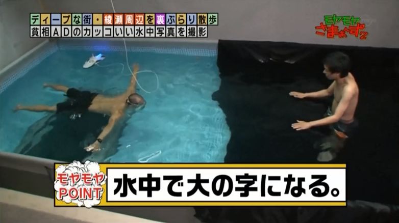 西川先生详细向永沼君说明了如何在水中摆出大字姿势以便拍摄。