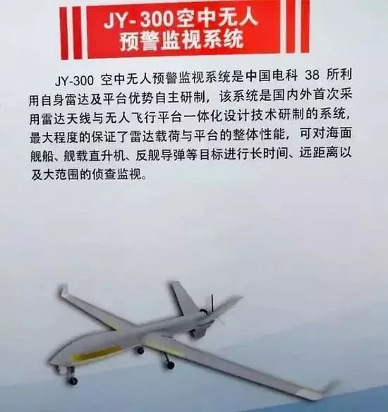 这款被称为JY-300型的空中无人预警监视系统由中电科38所负责研发,主要执行对海面舰船、舰载直升机、反舰导弹等目标进行长时间、远距离以及大范围的侦查监视任务。同时从相关展板资料中我们可以看出,该型无人机最大的亮点是在国内外首次采用了雷达天线与无人机平台一体化设计,也就是我们俗称的“共形天线”或“贴片雷达”技术,最大程度的保证了雷达载荷与平台的整体性能。根据展出的模型,不难看出JY-300的载机平台就是大名鼎鼎的翼龙-2型无人机。正是“共形天线”这项黑科技的运用,让原本作为察打一体无人机的翼龙2型实现了从无人机到预警机的华丽转身。