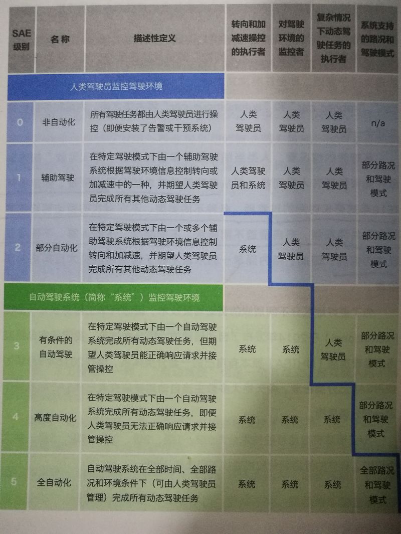 今天绝大多数主流自动驾驶研究者已将SAE(国际汽车工程师学会)标准当作通行的分类原则。SAE标准将自动驾驶技术分为0级、1级、2级、3级、4级、5级,共六个级别。具体的级别划分和描述如以下图表显示: