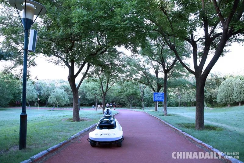 △航天三院的巡逻机器人在北京市丰台区云岗森林公园巡逻 。(摄影:封晓东)