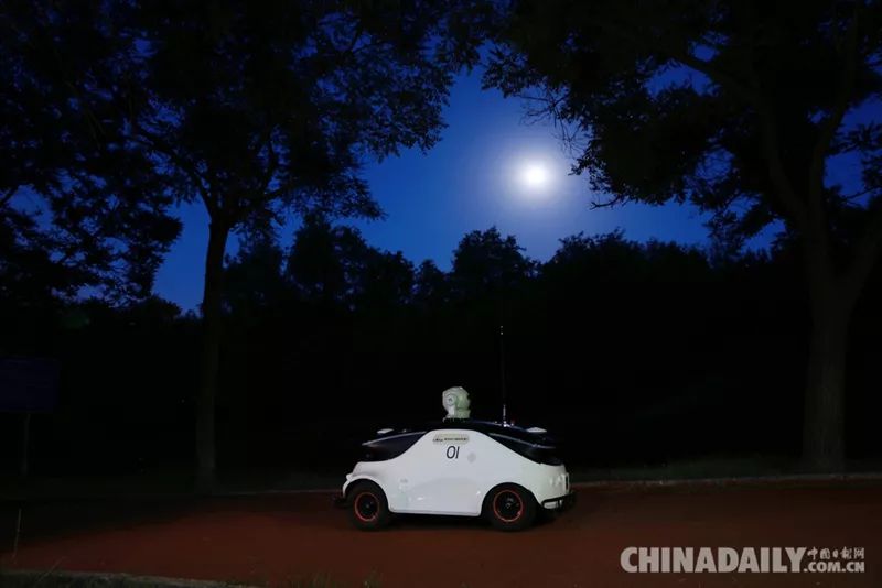 △航天三院的巡逻机器人在北京市丰台区云岗森林公园晚间巡逻。(摄影:封晓东)