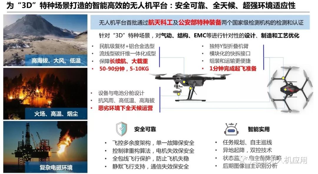公司自成立以来一直致力于无人机飞行平台及其配套服务的构建,研发并量产了数款多旋翼和垂直起降无人机、地面履带机器人、全功能便携地面站、手持遥控器和多种机载云台吊舱。且经过了高寒、高原、强风和强电磁辐射等极限环境检测,通过了航天科工和公安部两个国家级检测机构的权威实测认证,特别是在高海拔、高低温、强风雨和强电磁等极限环境下的巡检能力处于业内领先水平。