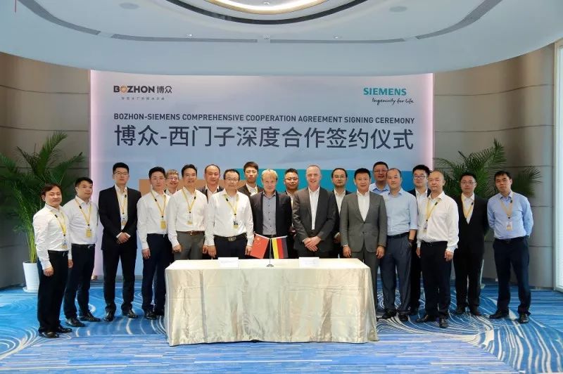 2018年7月2日,博众精工科技股份有限公司 (BOZHON)与西门子(中国)有限公司(SIEMENS)在博众总部举行深度合作会议并签署相关协议。博众董事长吕绍林及集团高层,西门子数字化工厂集团工厂自动化部全球销售总裁Guido Feind、西门子(中国)有限公司数字化工厂集团工厂自动化部总经理Joerg Westerholt、西门子(中国)有限公司华东区销售总经理刘志生等双方高层共同出席了签约仪式。
