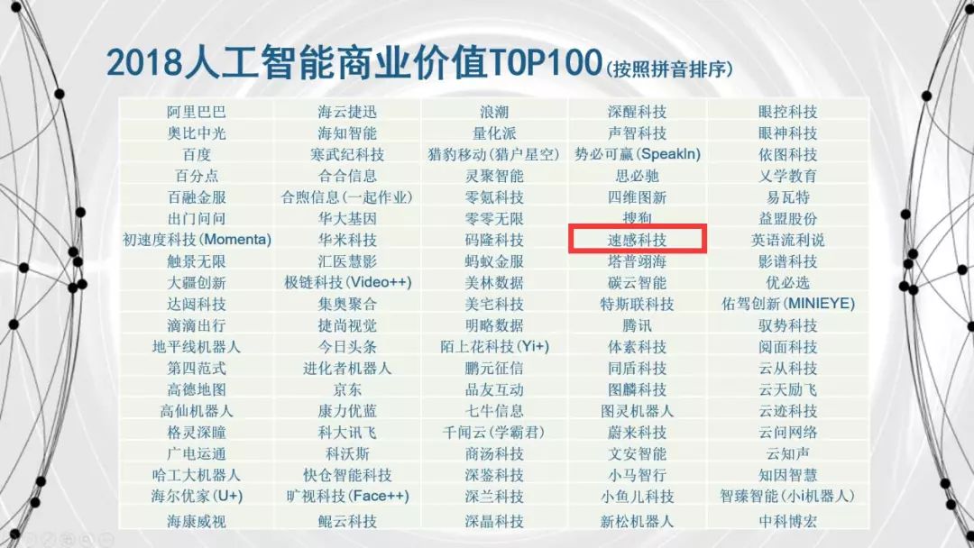 2018年7月20日,“中国人工智能国际合作大会”在成都隆重举行,本届大会以“智能引领产业升级 合作加速融合共赢”为主题,深度解读人工智能技术发展趋势,探讨人工智能发展未来。会上公布了“2018人工智能商业价值TOP100榜单”,速感科技与阿里巴巴、百度、科大讯飞等优秀人工智能企业共同入选该榜单。