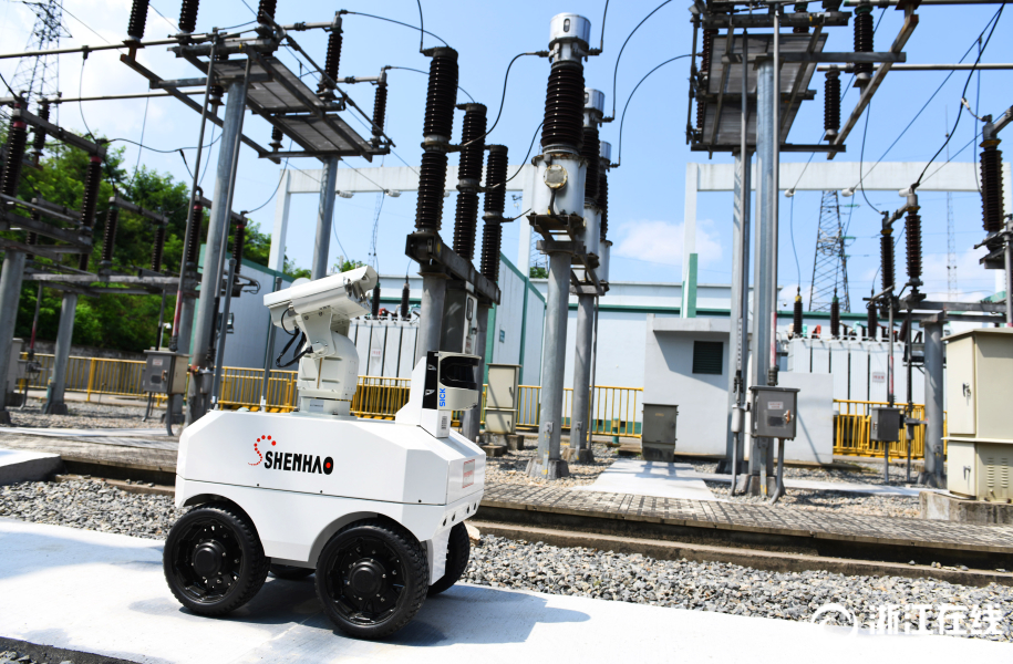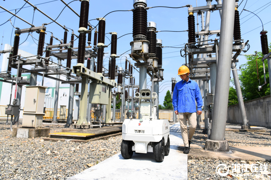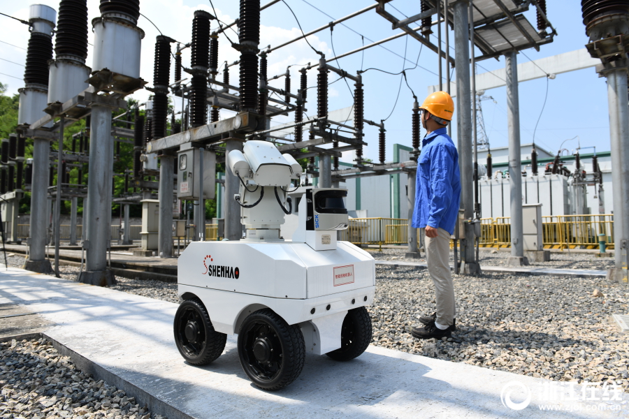 7月2日,在余姚市110千伏梁弄变电站内,一台智能巡检机器人正在巡检线路。