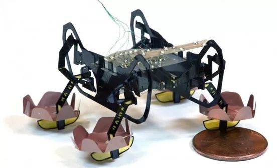 哈佛大学研究人员于2013年首次宣布了系绳驱动/控制的HAMR(哈佛动态微型机器人)机器人,其原始版本长度仅为4.4厘米,并且可以以高达每秒8.4倍自己身体长度的的最大速度沿着地面移动。它的结构灵感来自立体书,并将23个微观材料层夹在一起,然后将它们激光切割成所需的图案。