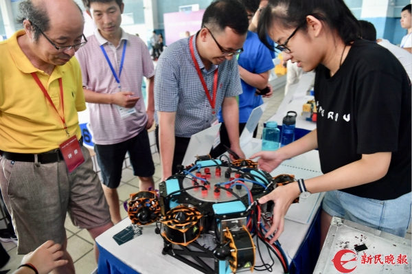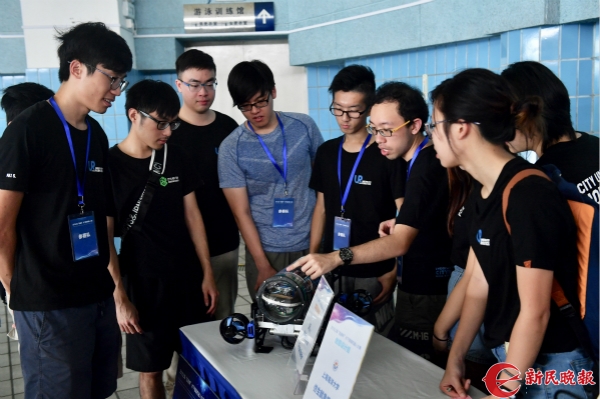 图说:队员们向评委介绍自己的水下机器人。新民晚报记者 徐程 摄