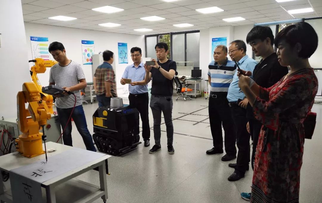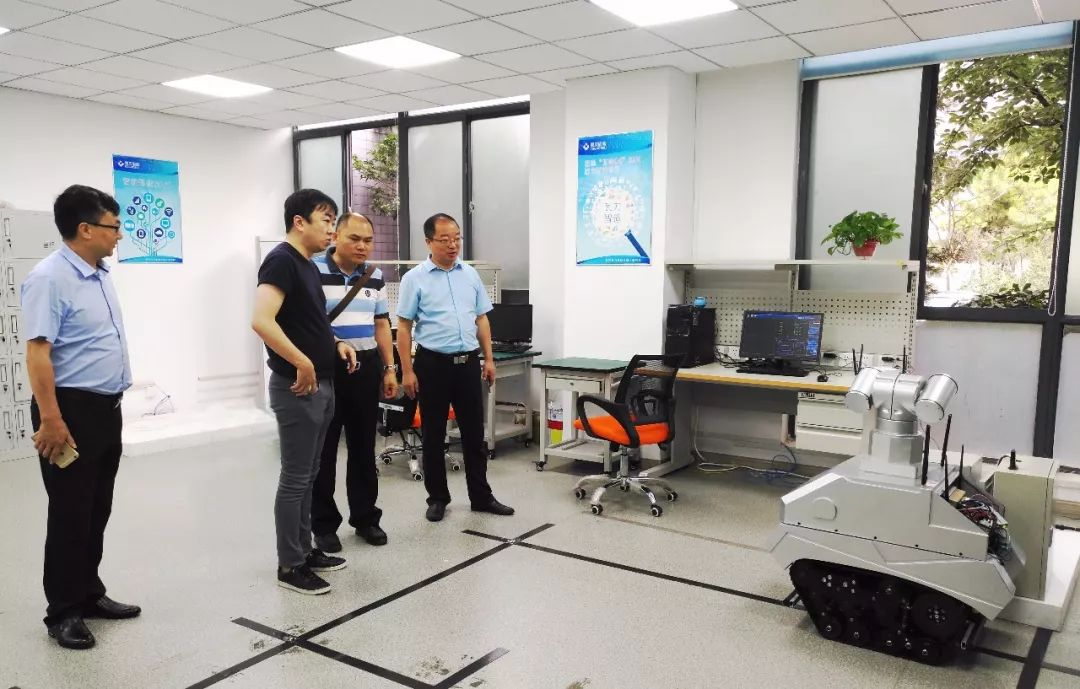 瓦力研究院向小野董事长展示并介绍了电力巡检机器人的应用场景及技术优势,小野泰助一行人对此表现了浓烈的兴趣。图中巡检机器人为研究院最新成果,是瓦力研究院长期以来深挖巡检机器人技术的第二代研究成果。