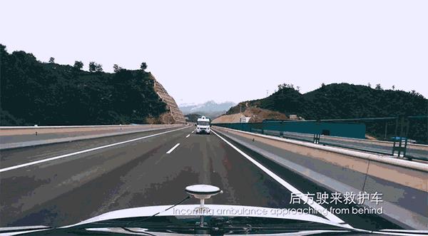 Apollo自动驾驶汽车通过声音识别和图像识别技术敏锐地察觉到正后方有救护车正在驶来,立即做出了向右变道避让救护车的决策。