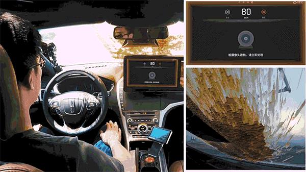 从天而降的泥浆将正在行驶中的Apollo自动驾驶汽车的前置摄像头完全遮住。系统监测到后,一边自动启动雨刷清理泥浆,一边发出提示并开始降速,等清除掉泥浆后,车辆又恢复到正常速度。