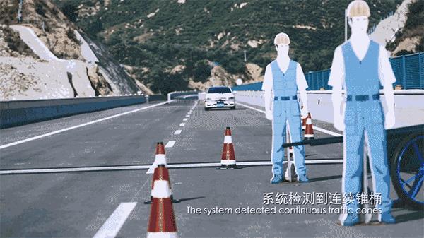 Apollo传感器检测到了前方连续的锥桶后,车辆自动减速,并进行自主变道,绕过了施工区域。