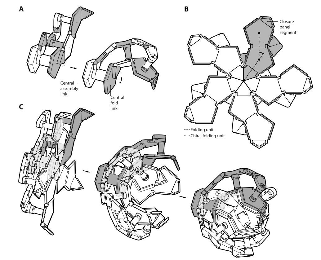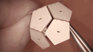 这个抓手最神奇的地方,是受到折纸的启发,机器人的5个花瓣附着在一系列的旋转接头上,仅需要一个电机就能让整个结构围绕其关节旋转,将抓手折叠成中孔的12面体。而且研究人员尝试了集中不同的形状,但这种12面版的效果最好。