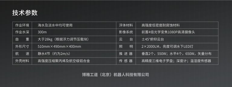 配备六个大功率推进器,动力性能强劲;可360°全向移动,最大下潜深度可达300m。