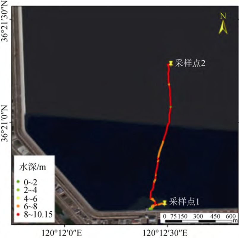 为验证无人船水样采集性能,于2015年7月15至17日在青岛棘洪滩水库进行了无人船水样采集实验。该水库作为引黄济调蓄水库,是一个人工修建的八边形水库,水库周长14km,水深大约10m。由于库区内无船舶,青岛市环境监测中心站每月例行水样采集只能在出水口和入水口进行,无法获取湖区内水样。在2015年7月15日实验过程中,无人船从水库南面的斜坡放下,设置了第一个水样采集GPS位点(36°20′36.32″N,120°12′29.06″E),离岸约50m,完水样采集后,设置了第二个水样采集GPS位点(36°21′16.93″N,120°12′31.04″E),离岸约1300m。实验中,水样采集瓶使用空矿泉水瓶,约500mL,采样时间约为45s。在两次定点采样中,位点跟踪精度均设置为6m,即无人船自动到达所设置的采样点周围6m范围内自动停船。