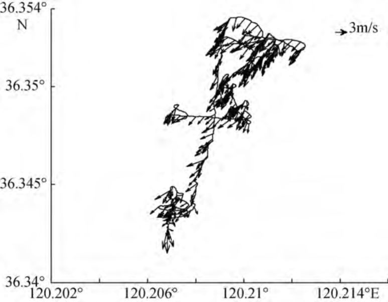 在图4和图5中,分别给出了无人船搭载的小型气象仪获取的典型的风速、风向、气温的连续测量数据。