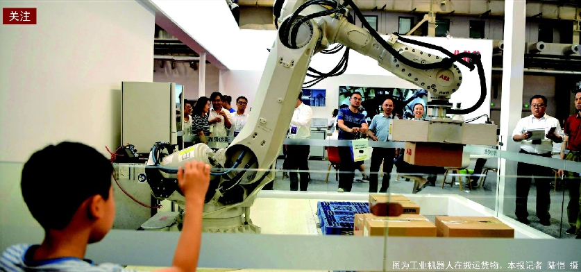 图为工业机器人在搬运货物。本报记者 陆恺 摄
