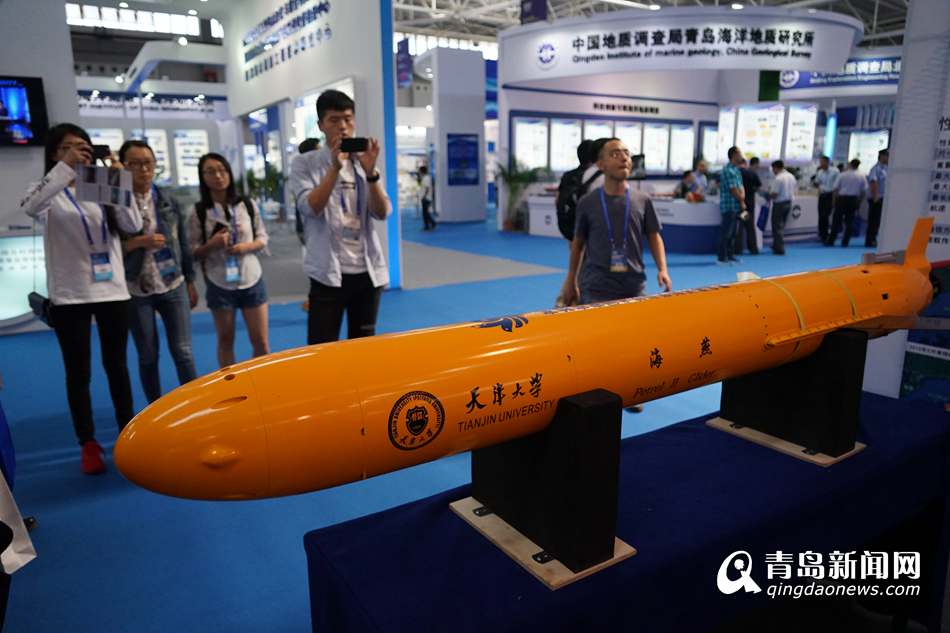 2017中国(青岛)国际海洋科技展览会展示的天津大学研制的“海燕”水下无人滑翔机。(资料图)