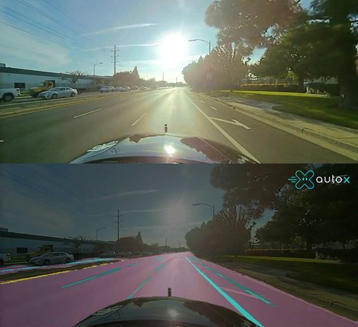 而在极端天气和环境下,比如暴雨、阳光直射、夜间,AutoX 的摄像头感知技术能保持稳定要归功于语义分析,即自动分割并识别出图像、视频中物体的类别。