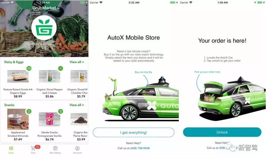 目前,AutoX 已经与当地的生鲜超市达成合作,用户可在 app 上不同的生鲜商店中挑选货品,并预约选定时间进行送货。以 AutoX 合作的 GrubMarket 为例,用户付款下单后,可以在第二天的任意时间段内选择让无人车派送(货物由超市人员挑选、打包上车);货物送达后,用户只需通过 app 即可打开车厢窗户或后备箱并完成取货。