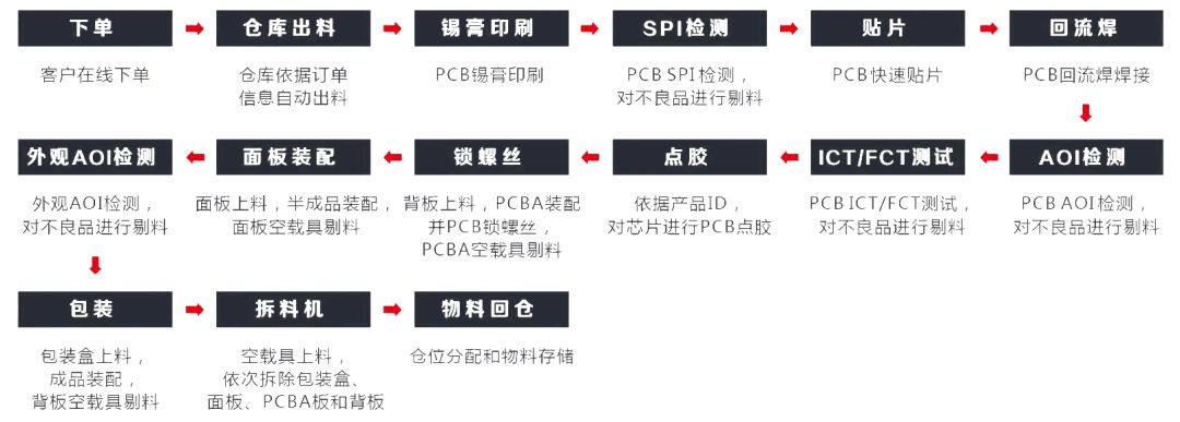 示范平台产线主体的主要功能为仿真消费类电子的生产流程,包括SMT、测试、装配等典型生产流程,产线由测试方案、生产设备与装配设备搭建而成,具体生产工序参见下图。