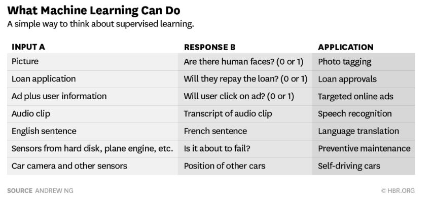Ng强调,虽然人工智能已经有很多成功的实施案例,但大多数都是在监督学习的场景下展开应用。在这一模式下,每一个训练输入数据库与正确的输出决策相关联。机器学习算法通过比对这个训练库的信息来根据新的输入数据做出决策。监督学习的一些常见应用包括照片标记、贷款处理与语音识别。在每一个应用案例中,系统都会接收输入信息 — 比如照片标签应用中的图片 — 并基于它从训练数据库中学到的信息做出决定或做出反应。