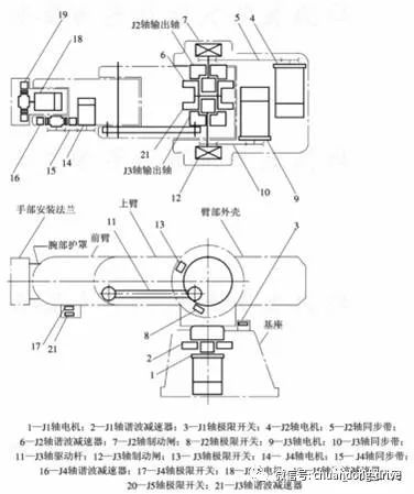 (1) 肩部(J2轴)由肩关节处的调谐齿轮⑥驱动, 由连接在J2轴电机④上的同步带⑤带动旋转。