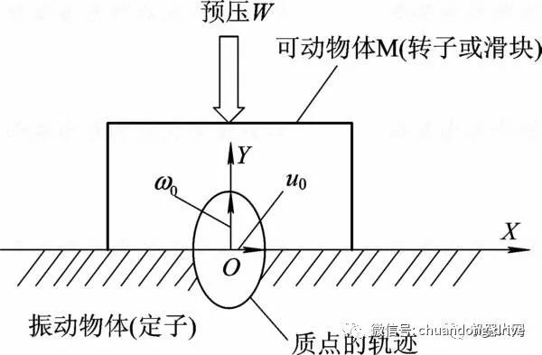 超声波电机的工作原理是用超声波激励弹性体定子,使其表面形成椭圆运动, 由于其上与转子(或滑块)接触, 在摩擦的作用下转子获得推力输出。如图2.78所示, 可以认为定子按照角频率ω0,进行超声波振动, 在预压W作用下, 转子被推动。