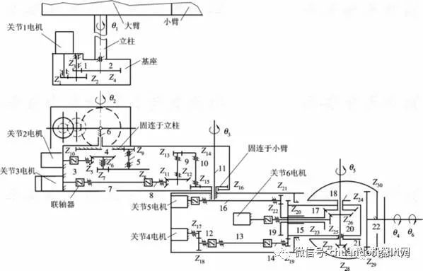 电机3通过两个联轴器和一对圆锥齿轮Z1、 Z2、 两对圆柱齿轮Z13、 Z14, Z15、 Z16(Z16固联于小臂上)驱动小臂相对于大臂回转。