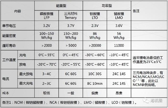 电池分为能量型和功率型两种,理想的电池要求成本适中,能量密度高,充电倍率大,能耐极寒极热。磷酸铁锂电池缺乏有效均衡能力,低温能力一般。钛酸锂电池整体性能优于磷酸铁锂电池。三元电池能量密度高,整体性能介于钛酸锂电池和磷酸铁锂电池之间,具体选型时需综合考虑。