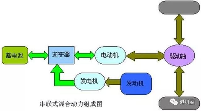全柴油方式不讲了,由于污染和能耗问题目前基本已经淘汰了。AGV的柴电混合动力大多数属于串联式的,什么意思呢?就是布置一整套发动机组,供电给电动机,再由电动机驱动AGV。发电机组在供电给电动机的同时还需供电给锂电池,锂电池平时不工作,在AGV峰值功率时进行放电,弥补电动机峰值功率的不足。空载和匀速运行时就直接由发电机组提供功率即可。