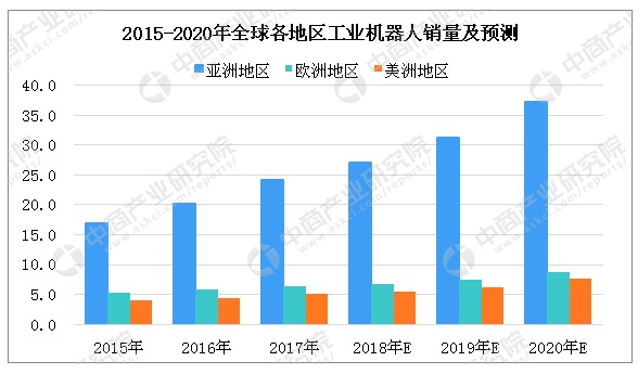 在全球各地区工业机器人销量情况中,2017年亚洲工业机器人总销量达到24.2万台,工业机器人销量实现爆发式增长,预计2020年销量将有望突破35万台;2017年欧洲工业机器人销量为6.4万台,与2016年的5.9万台增长8.9%;美洲地区工业机器人销量为5.0万台,同比增长17.1%。
