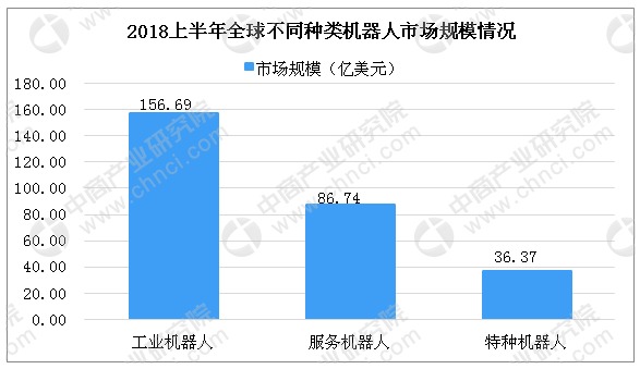 在市场构成方面,2018上半年全球工业机器人市场规模为156.69亿美元,占整体机器人市场规模的56.0%,服务机器人市场规模为86.74亿美元,收入占比为31.1%;特种机器人市场规模为36.37亿美元,市场收入占比为13.0%。