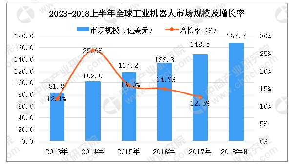 2018上半年全球工业机器人市场规模为167.7亿美元,2013-2017年,全球工业机器人市场规模不断攀升,年均复合增长率达到16.1%;伴随着技术的逐渐成熟,机器人性能提升和应用场景的拓展,全球工业机器人市场需求不断上升,未来工业机器人市场将进一步增长。