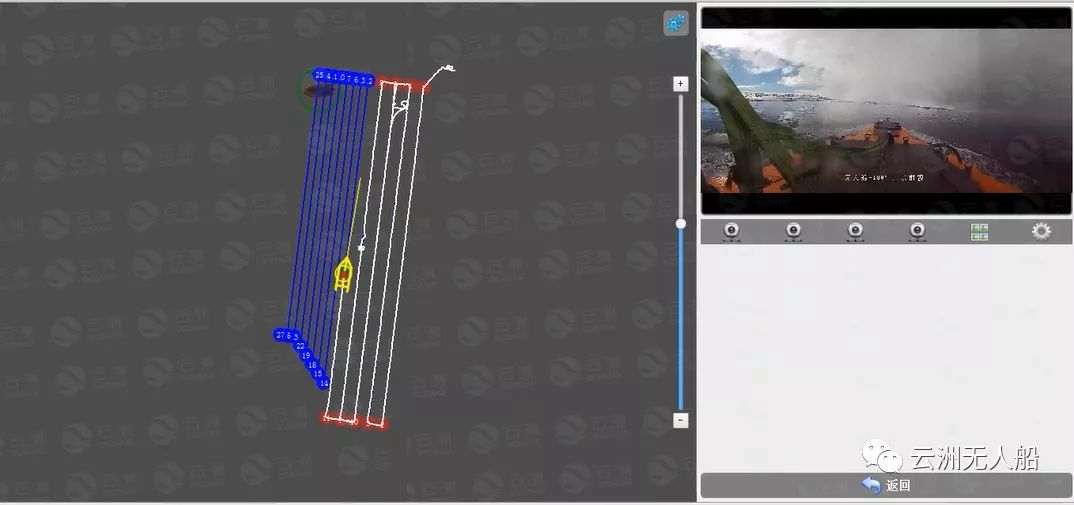 (蓝色标注为吊放水域,白色标注为人员操作及通讯架设区域,红色标注为备航测试水域)